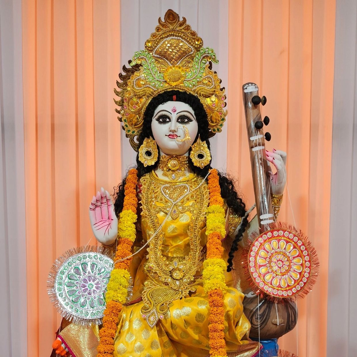 Saraswati Puja is a Hindu festival dedicated to Goddess Saraswati, the goddess of knowledge, wisdom, learning, music, and the arts. She is considered the embodiment of pure knowledge and is often depicted as a serene figure, seated on a white lotus, holding a veena (a musical instrument), and surrounded by sacred texts and a swan, symbolizing purity and wisdom.